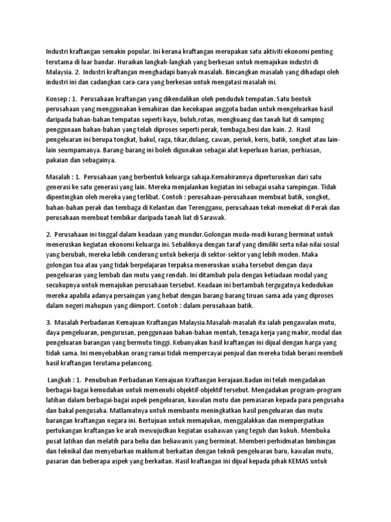 Hubungi kami perbadanan kemajuan kraftangan malaysia kompleks kraf kuala lumpur jalan conlay 50450 kuala lumpur 03 2162 7459 03 2161 2622 pro at kraftangan gov my. Industri ini merupakan satu industri yang berpetensi besar untuk membantu meningkatkan tahap kehidupan masyarakat terutama masyarakat desa.